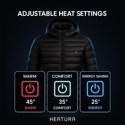 The jacket features advanced Japanese Toray carbon fiber heating elements that provide quick warmth across core body areas, including the neck. Simply press a button to switch between 3 temperature settings for personalized comfort.