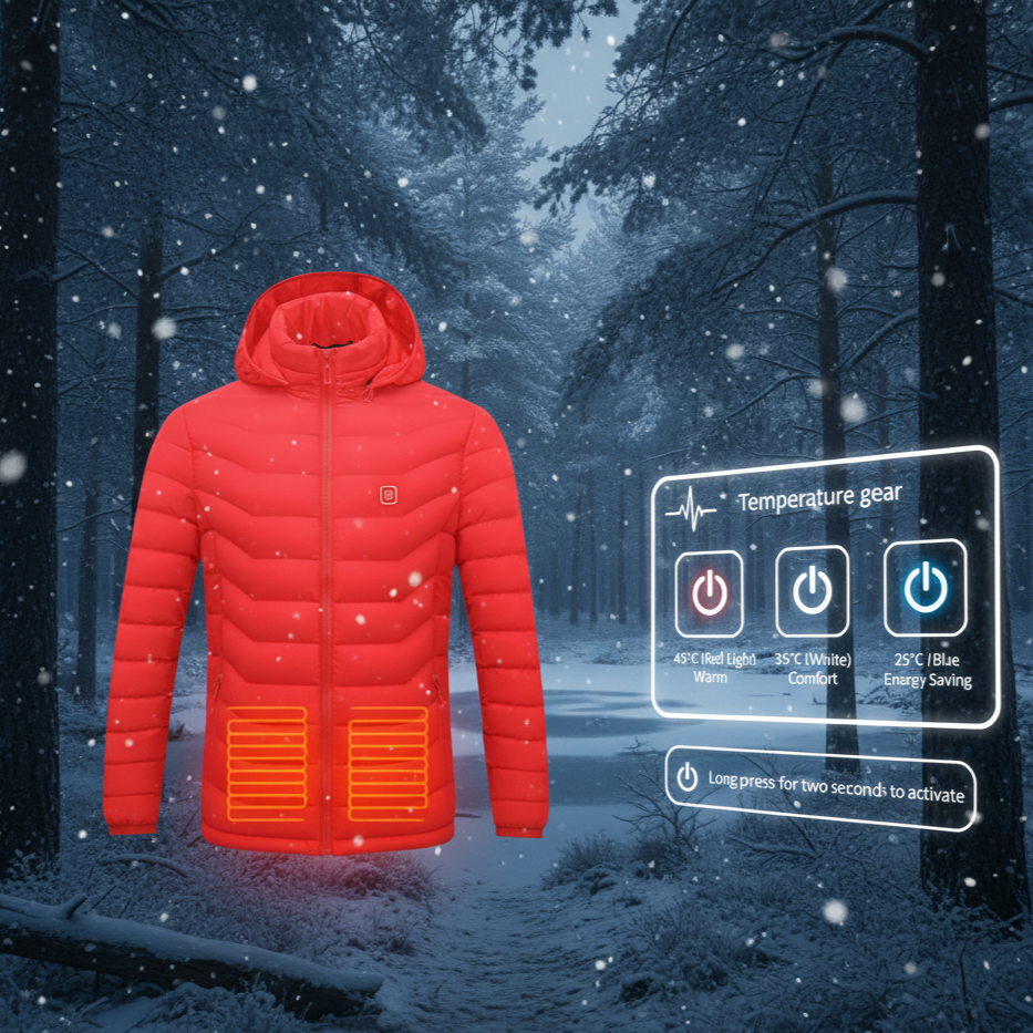 The jacket features advanced Japanese Toray carbon fiber heating elements that provide quick warmth across core body areas, including the neck. Simply press a button to switch between 3 temperature settings for personalized comfort.